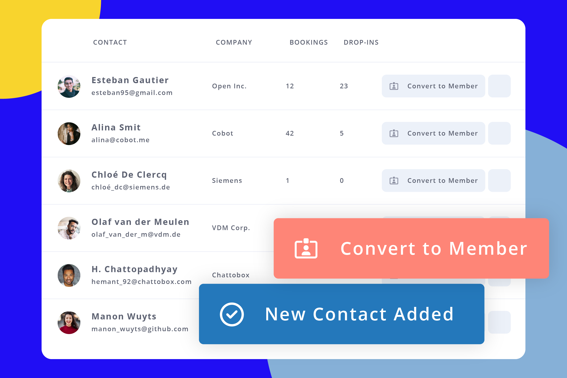 We're excited about this one, and we bet you are too: there's a brand-new feature for you to manage non-members using your space. Any lead or contact you want to track can now be organized under Manage » Contacts. Anyone who is making external bookings on your site is also automatically added to this list.