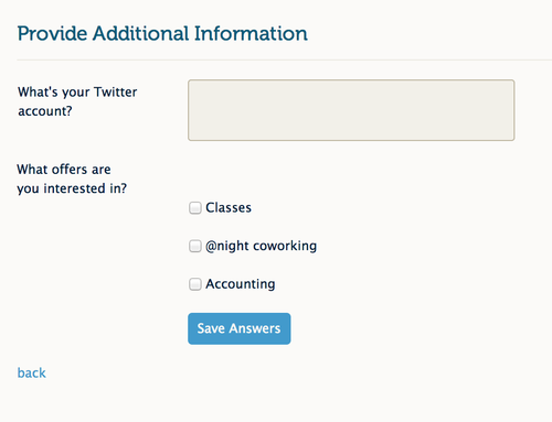 When new members sign up for your space Cobot can ask them a few questions on your behalf. A lot of spaces use this to ask for things like profession, social media accounts or to just get to know their prospective members better.