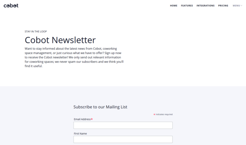Have you heard? We’ve started a monthly newsletter! It’s a great way to stay up-to-date on the latest Cobot improvements, coworking news, and special offers. We only send useful and relevant information, and don’t worry: we never spam our audience. If this is something that sounds interesting, you can sign up for the Cobot Newsletter on our website.