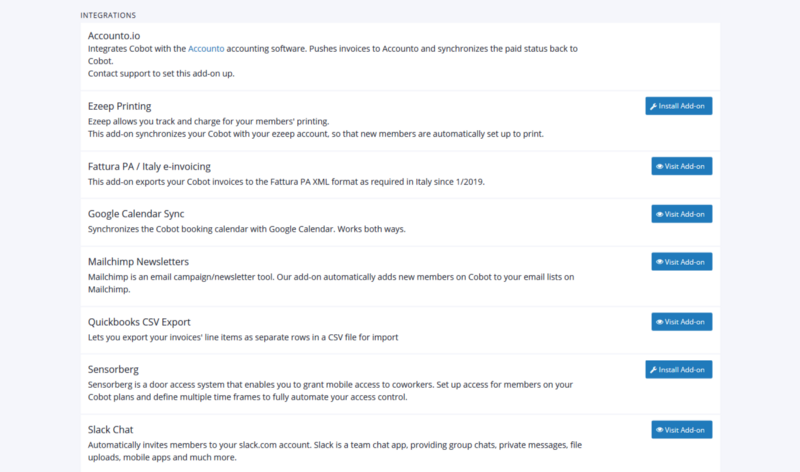 Cobot now offers two new integrations! The first is with Accounto, an automated accounting platform that can give you more powerful insights and tools to understand your space’s revenue. You can push your invoices to Accounto and it will synchronize the paid status back to Cobot.