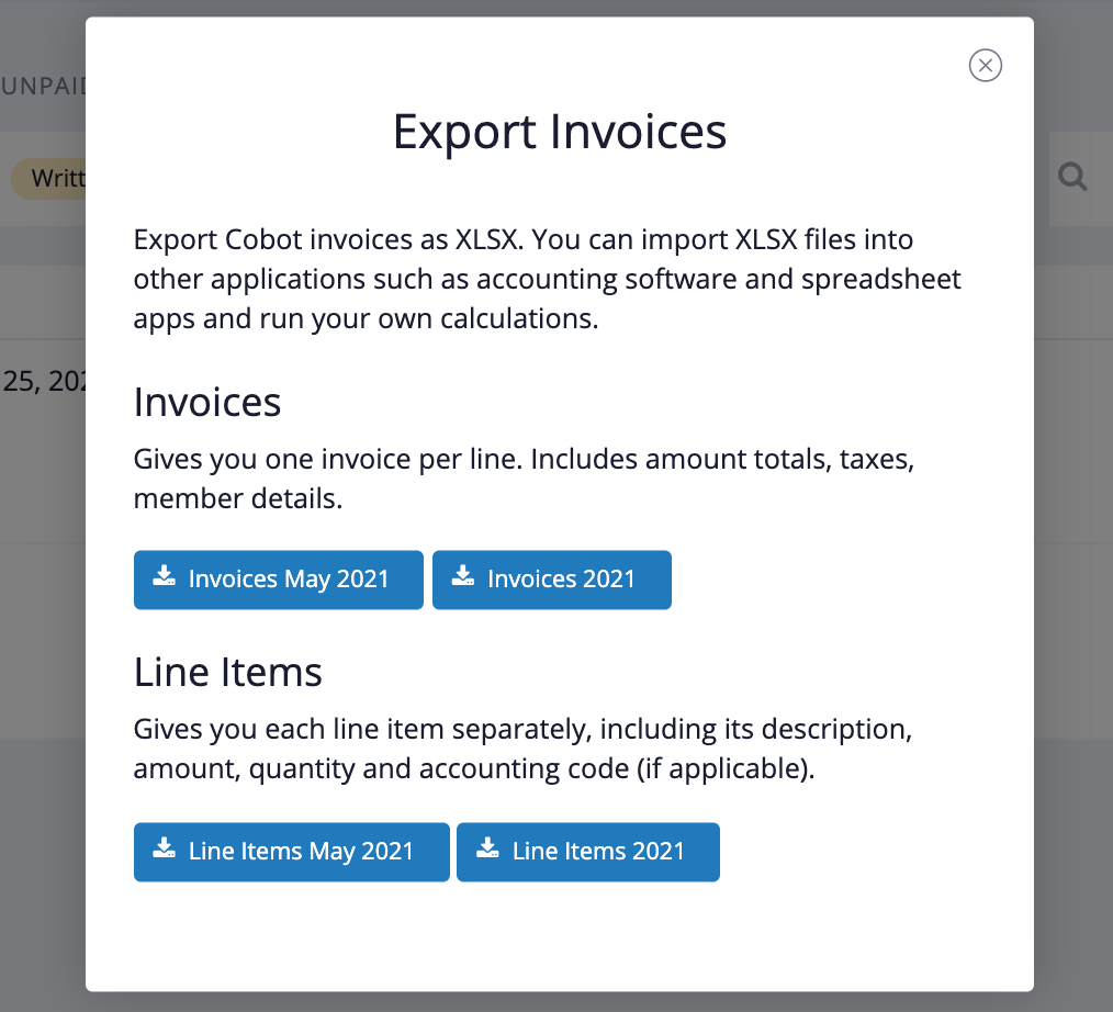 💡 New! Cobot now offers a direct integration with QuickBooks. You can automatically sync invoices shortly after they're created—no need to format exports manually or rely solely on Zapier. Prefer manual uploads? You can still download a CSV file made specifically for QuickBooks.
