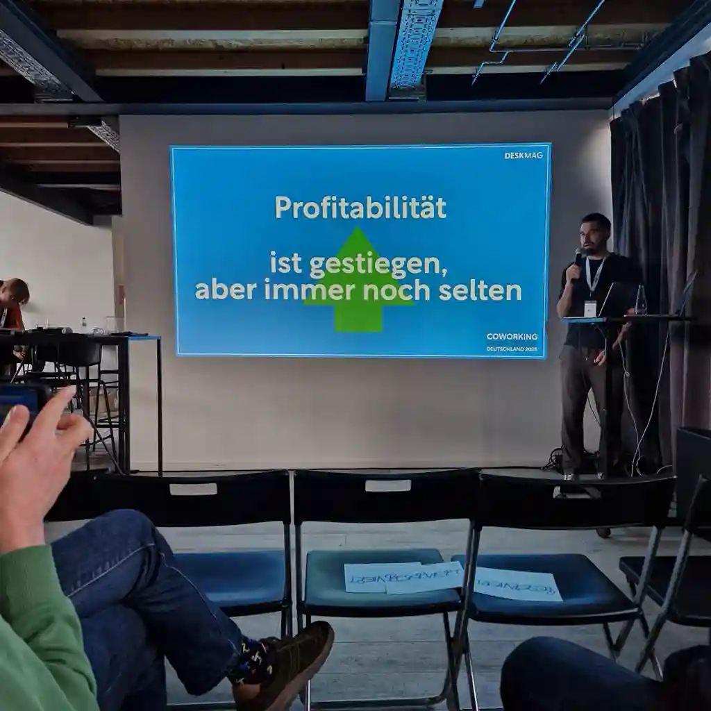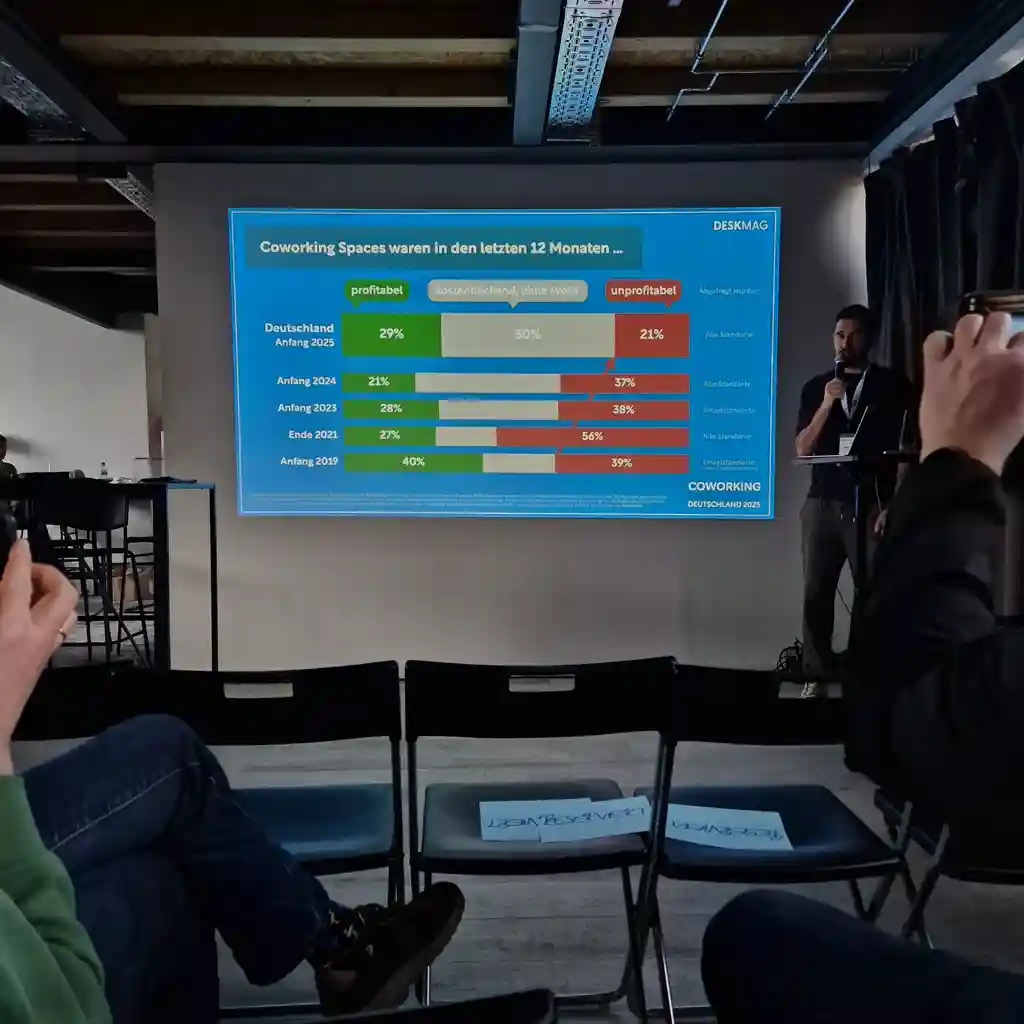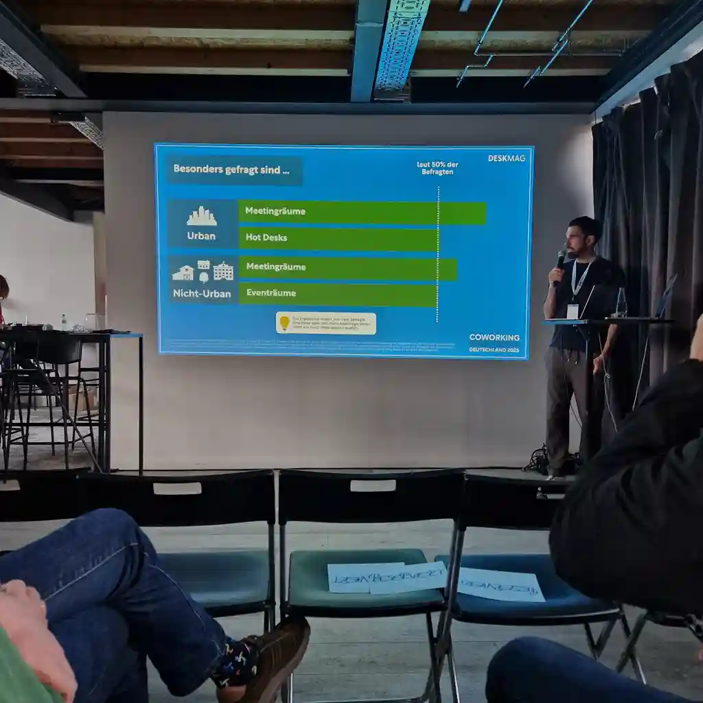 Following that, Carsten from Deskmag took the stage and presented us with his newest coworking statistics and numbers. In short, his numbers reflected an increase of trust in the future and continuous COVID recovery in German and European coworking spaces.