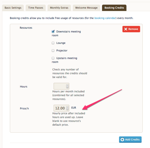 You can now charge members different rates for booking resources. To set it up add/edit a plan, click on the booking credits tab and enter a price per hour for the resource.