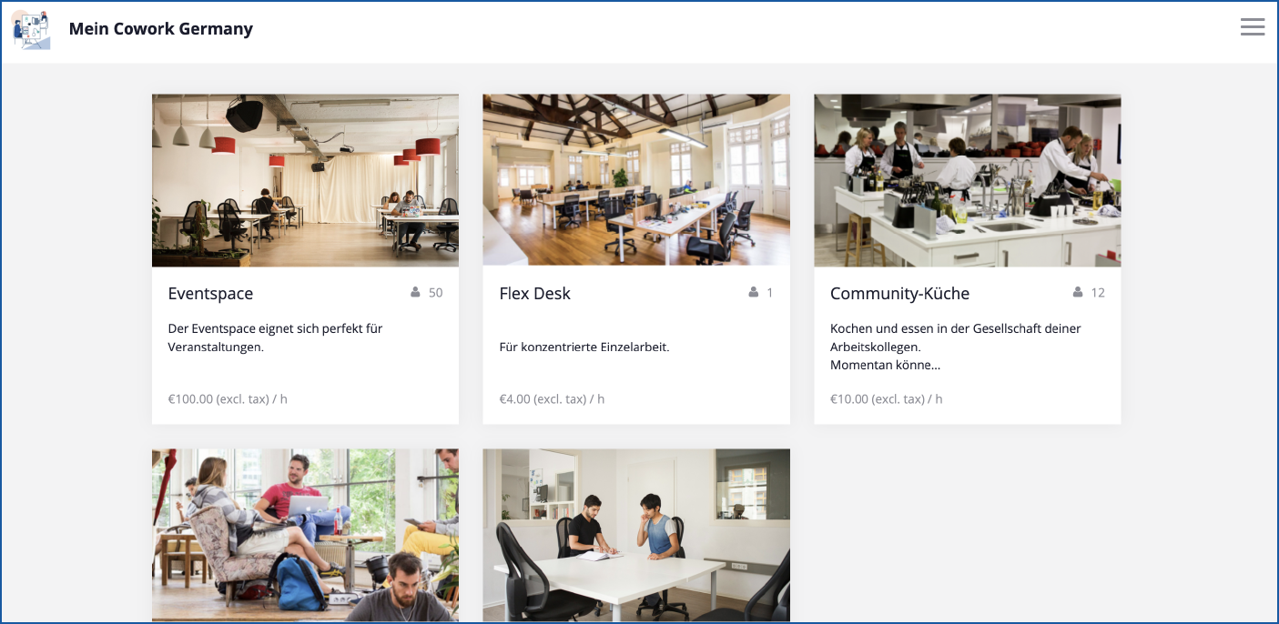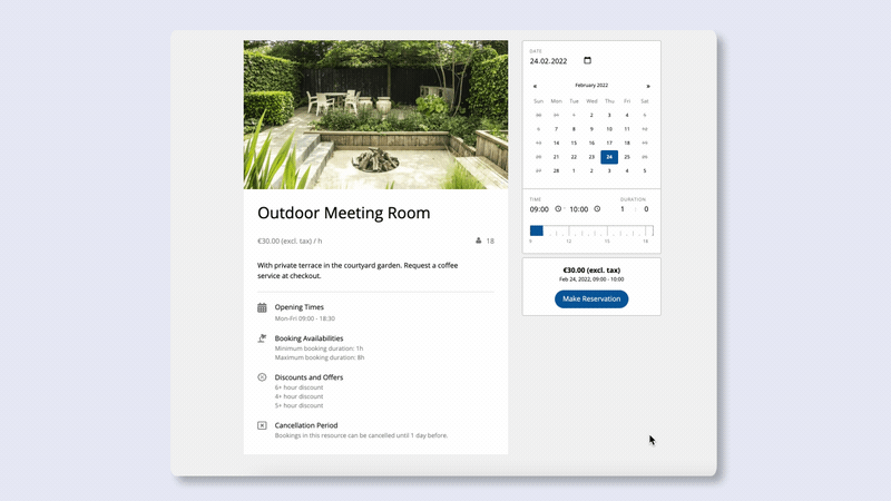 Deine Besucher*innen werden nun auf der neuen Schnittstelle mit der Beschreibung einer Ressource, ihrer Kapazität, den Öffnungszeiten sowie der Kündigungsfrist begrüßt.