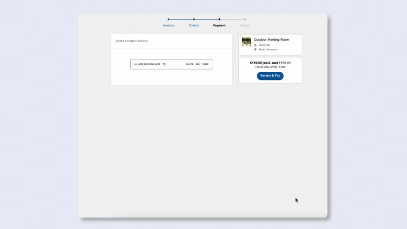 Sobald sie eine Ressource ausgewählt und die Kontaktdaten für die Buchung eingegeben haben, können Besucher*innen ihre Buchung sofort per Kreditkarte bezahlen, sofern du die Zahlungsintegration mit Stripe eingerichtet hast.
