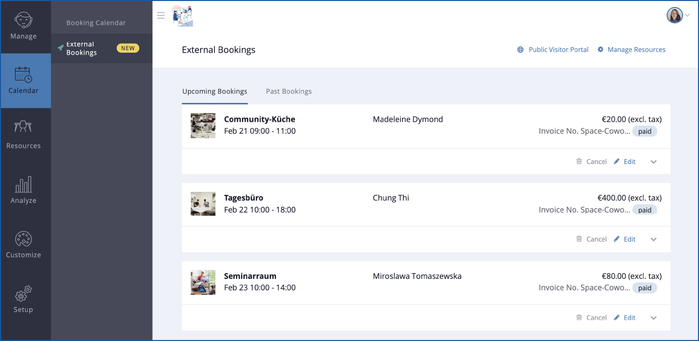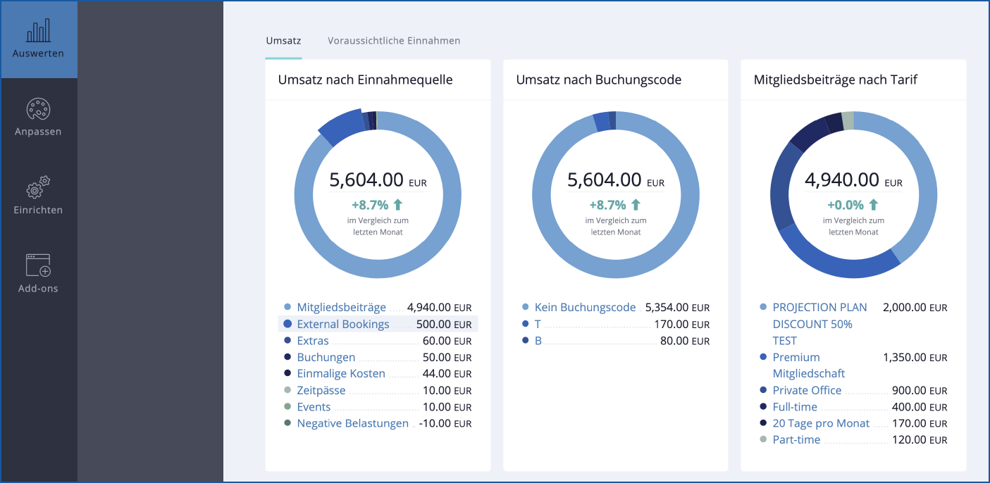 Sobald du Externe Buchungen aktivierst, erhältst du erweiterten Zugriff auf wichtige Kennzahlen und Zahlungsdaten. Siehe ausstehende Rechnungen für externe Buchungen auf dem Dashboard unter Verwalten ein und gehe anschließend zu Auswertung, um zu sehen, wie sich deine externen Buchungen unter Umsatz summieren und was sie für deine Ressourcen unter Buchungen im Detail bedeuten.