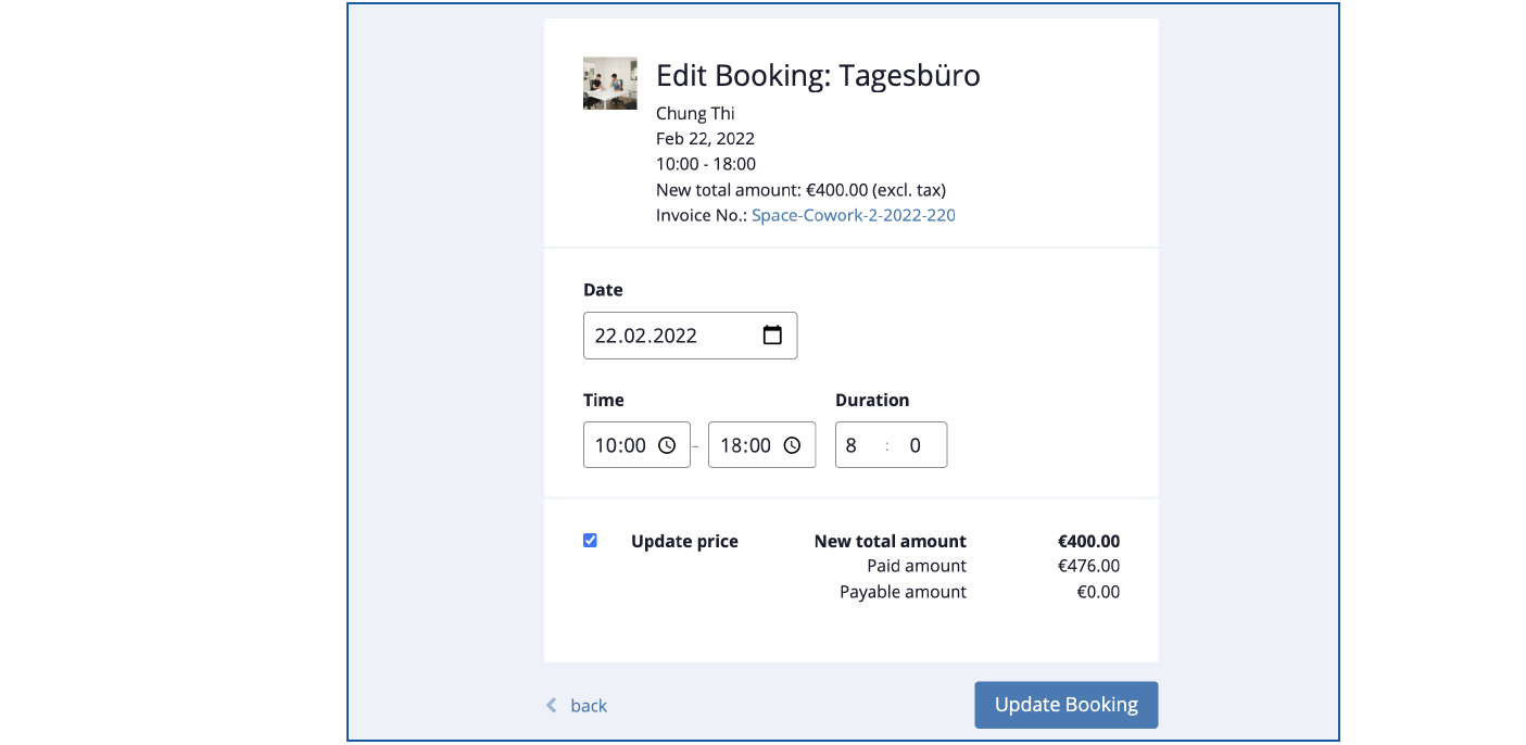 Möchtest du jemandem eine zusätzliche Stunde für die erste Workshop-Buchung schenken? Das kannst du jetzt ganz einfach tun! Hast du einen verzweifelten Anruf von eine:m Besucher*in erhalten, der/die eine Buchung für einen Meetingraum um eine Stunde verlängern möchte? Mit nur ein paar Klicks kannst du alle notwendigen Änderungen vornehmen und eine Rechnung für die Differenz erstellen.