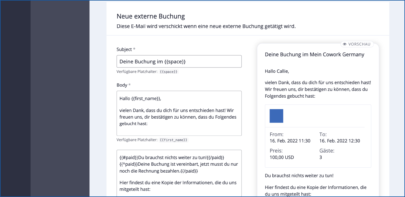 Alle E-Mails, die Besucher*innen erhalten, sind im Abschnitt Anpassen » E-Mails deines Accounts zu finden. Verwende dynamische Elemente, um genau auf ihre Bedürfnisse einzugehen, z. B. um eine Buchung abzuschließen, wenn sie per Rechnung bezahlen, oder um den Erfolg ihrer Kartentransaktion zu bestätigen. Gib Informationen weiter, die sie bei der Ankunft an der Rezeption benötigen, detaillierte Parkanweisungen und weitere Infos, die ihnen helfen werden, ohne Probleme zu deinem Space zu gelangen. Jede E-Mail enthält außerdem integrierte Zusammenfassungen der Buchungsdetails und persönlichen Daten, sodass die wichtigsten Informationen immer auf einem Blick einsehbar sind.