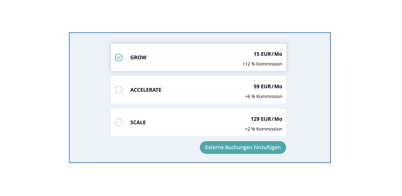 Sobald dein monatlich wiederkehrender Umsatz für externe Buchungen etwa 700€/USD übersteigt, wird es günstiger, zum Tarif Accelerate zu wechseln, mit einem festen monatlichen Tarif von 59€/USD und einer Kommissionsgebühr von 6 % auf den Umsatz externer Buchungen.