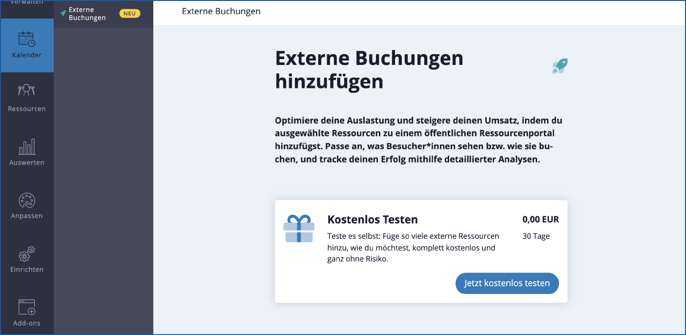 Du kannst die Funktion an zwei Stellen in deinem Account aktivieren: entweder unter Kalender » Externe Buchungen oder unter dem kürzlich erneuertem Bereich der Tarif-Verwaltung
