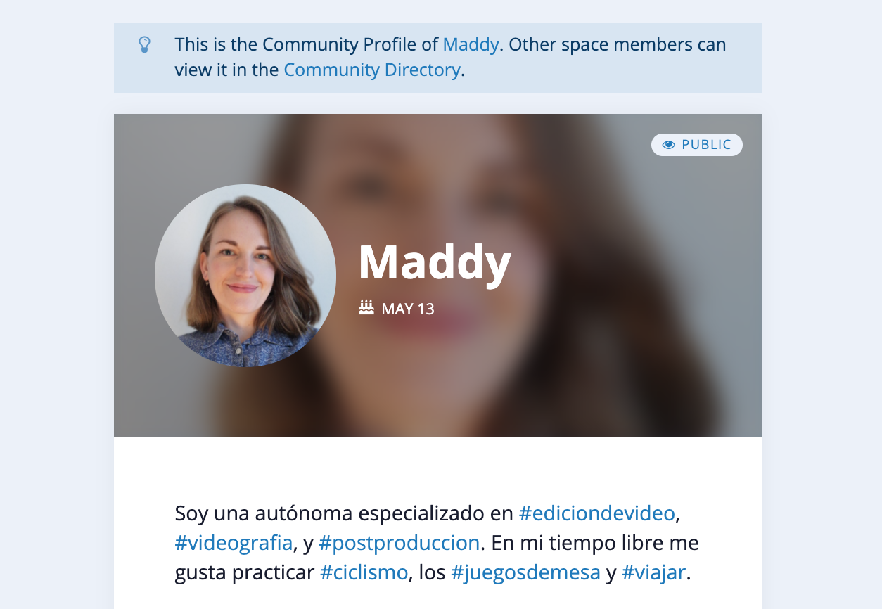 Los perfiles de la comunidad es el lugar donde cada usuario/a puede añadir información sobre quiénes son, qué hacen, porqué se han unido al espacio, y elegir si quieren compartir esa información o mantenerla en privado.