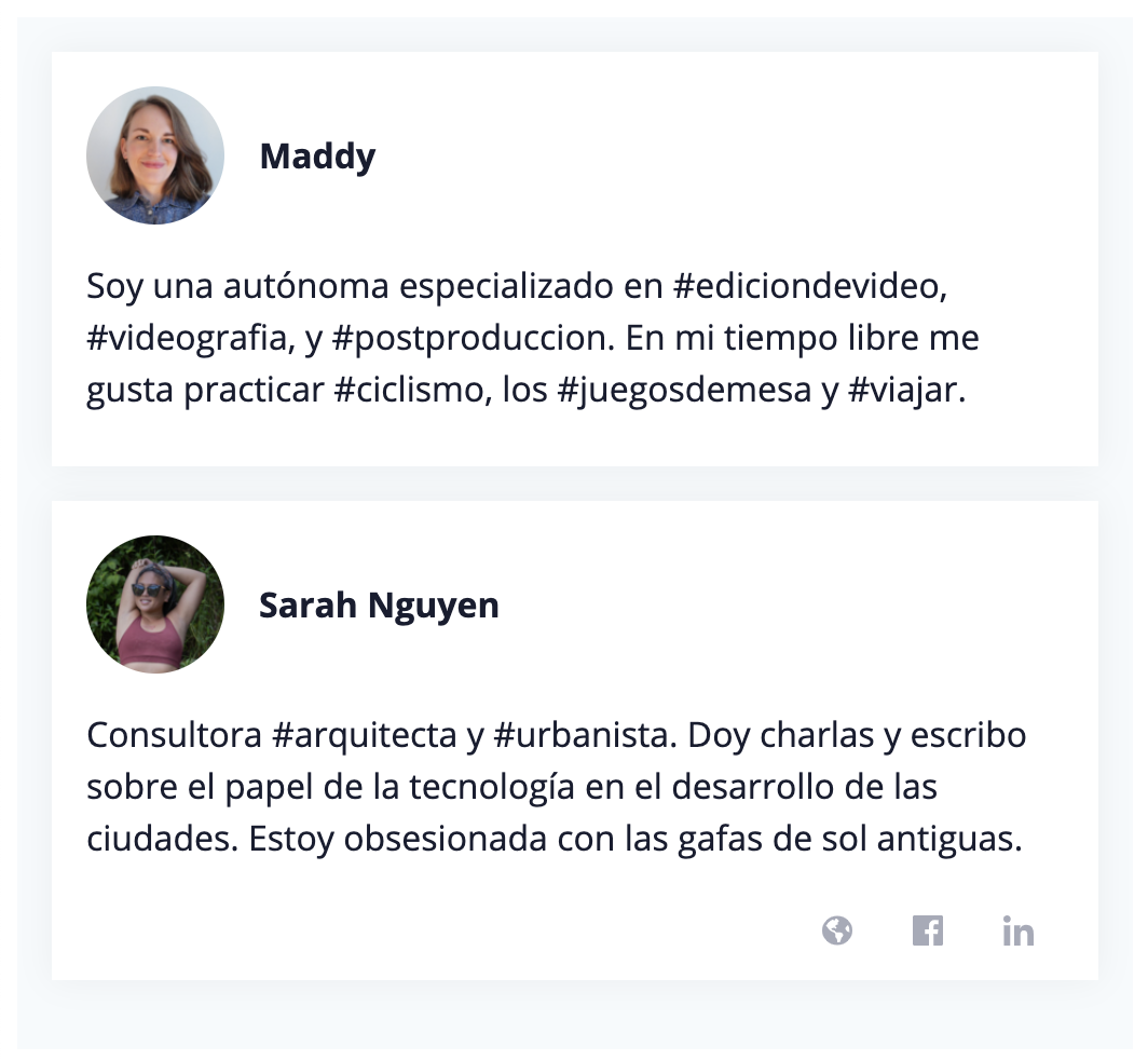 Si su espacio alberga a muchos autónomos, los hashtags son una forma estupenda de ayudarles a conectarse. Estos hashtags, de habilidades y servicios, permiten a personas que habitualmente no coincidan en el espacio a conectarse con esa otra que estaban buscando y a la que de manera orgánica no habrían podido conectarse.