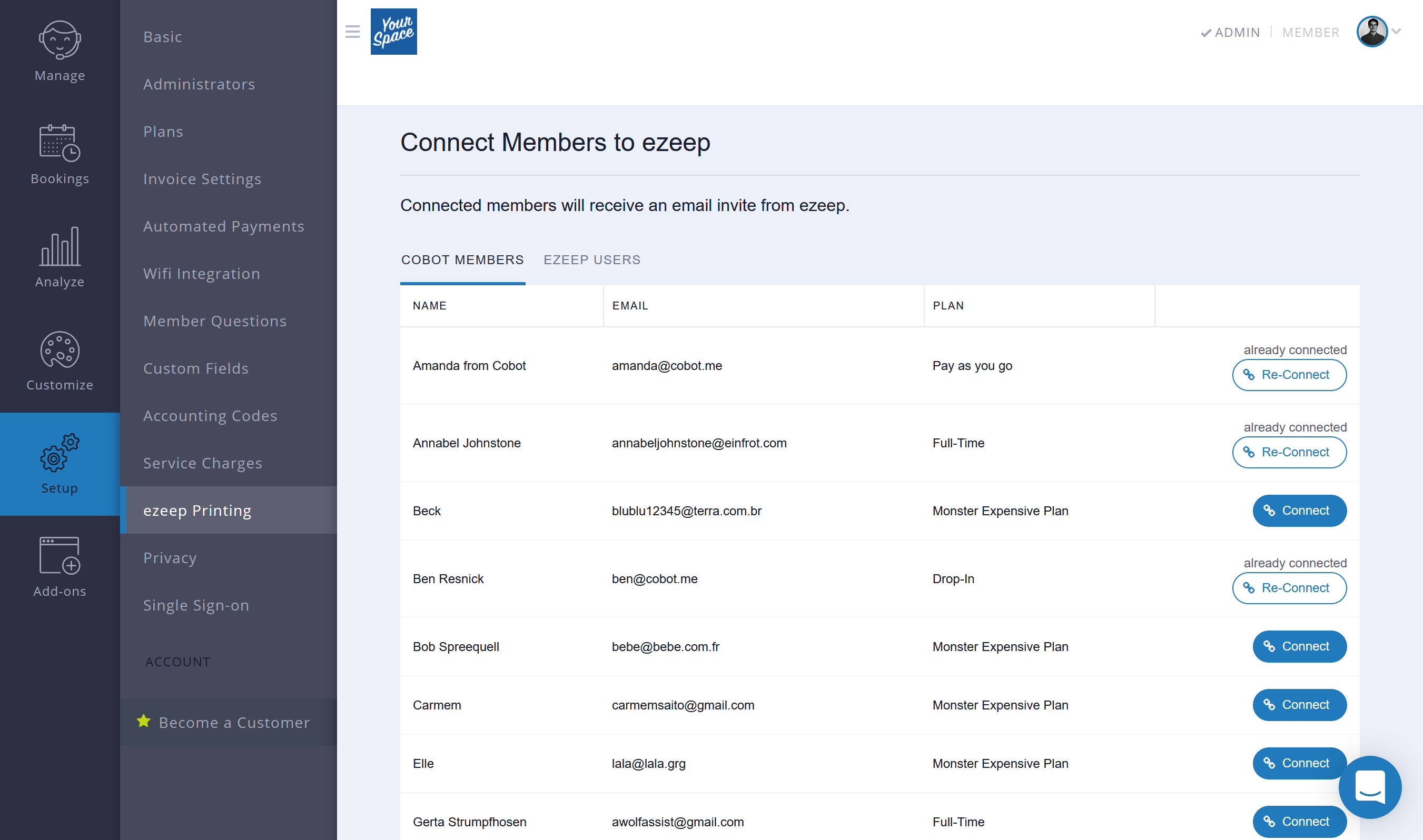 Previously, there was a minor issue with ezeep where members who were not connected—either through deletion or by never confirming their membership with ezeep—would be unable to reconnect to ezeep later if they decided they wanted to. Now admins can go to the ezeep Add-on page and simply select “Re-Connect” to set up a disconnected account as though they were connecting for the first time.