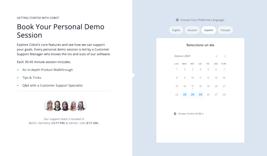 Cobot has always offered personal demo calls with our support team; it’s one of the ways we get to demonstrate our value and the advantages of using Cobot to manage your space. For everyone who goes to schedule a free support call with our team, the interface just got a whole lot nicer! Visitors can select their time slot by language instead of support team member, an intuitive way of booking time with our Cobot experts.