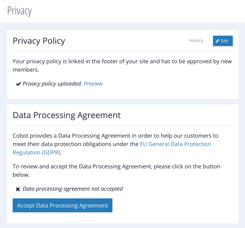 To be GDPR-compliant while using Cobot, you will need to enter into a Data Processing Agreement (DPA) with us. Why is that important? A DPA clarifies the actions Cobot takes to protect all the personal data we require from you and your coworkers. It explains in detail how Cobot collects, uses and passes on data to third parties, integration partners or payment providers. You will find the Data Processing Agreement under ‘Setup » Privacy’.