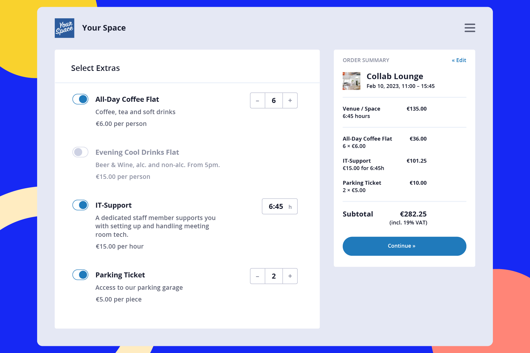 You’re in luck! We’ve developed a much-anticipated beta feature for anyone using External Bookings—a checkout process that enables visitors to buy your space’s products and services! Add flipcharts, coffees, projectors, cleaning fees, and more as options for each booking. This will soon be available to everyone using External Bookings.