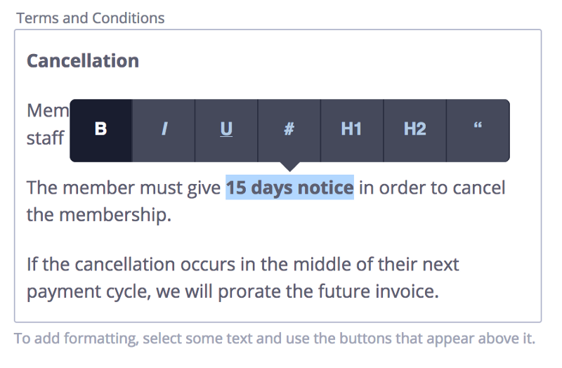 We had originally formatted the plans to support text editing, but this created a few difficulties for some of our users. As such, we decided to remove markdown from the forms we offer in Cobot’s interface, as for example in the plan settings. Now when you set up a plan under “Setup” » “Plans”, you can format the terms and welcome/signup messages directly in the form. Markdown skills are no longer required to input your information.