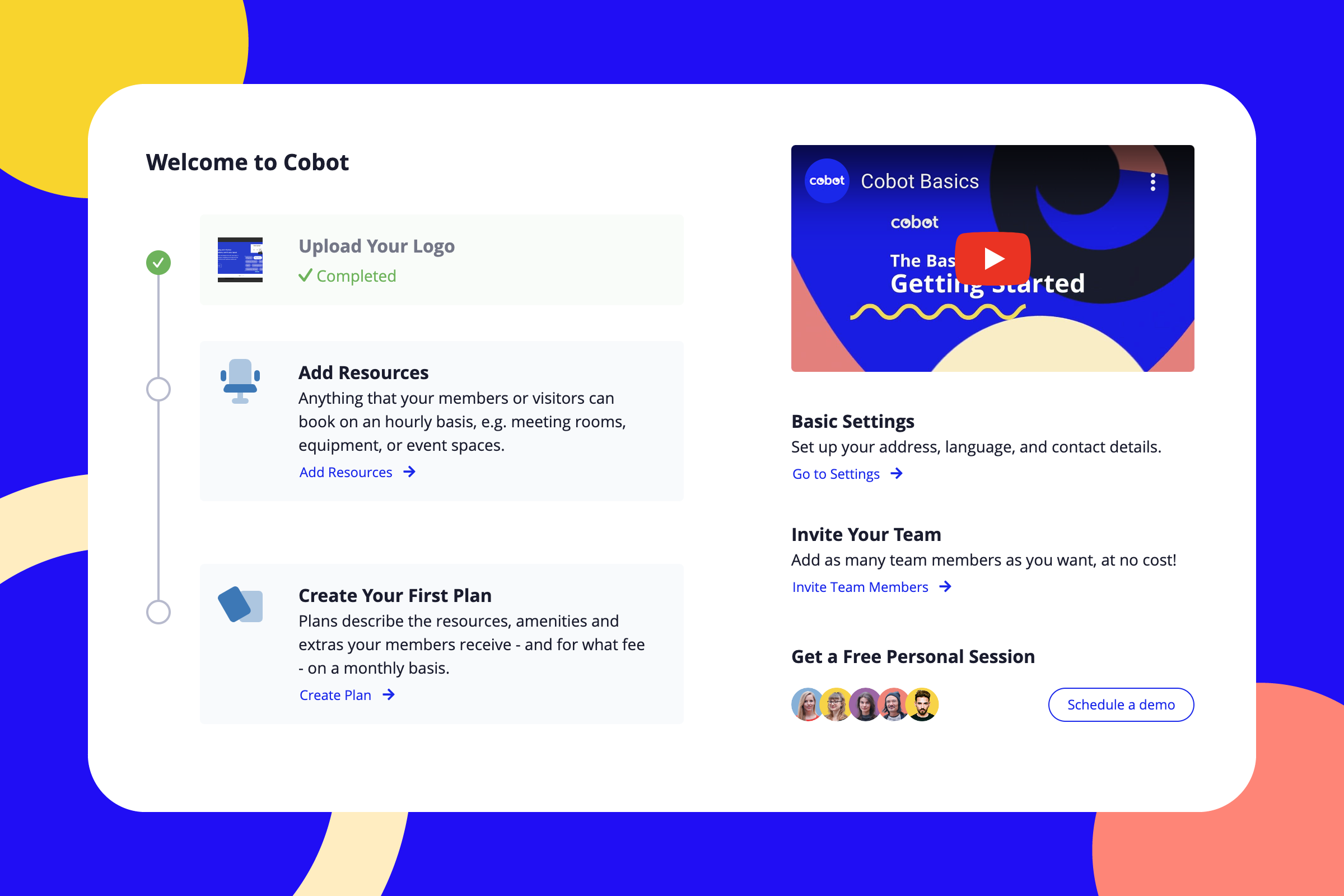 The Getting Started Page greets new space admins, helping them to quickly set up their coworking space. A guided tour points you to the first steps needed to get things up and running, such as creating membership plans, adding meeting rooms and event spaces, or uploading a logo.