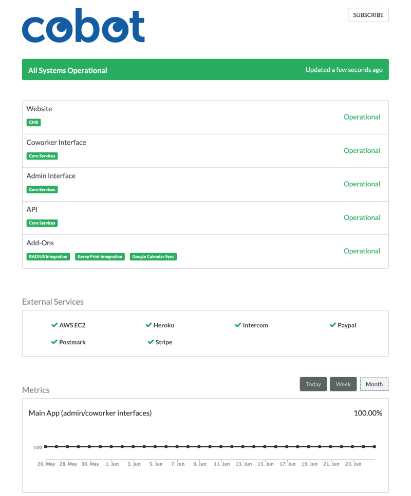 We’ve always offered our current status as a tool for anyone who uses Cobot. But we’ve added a new status page with detailed information and statistics on the current Cobot status, including: