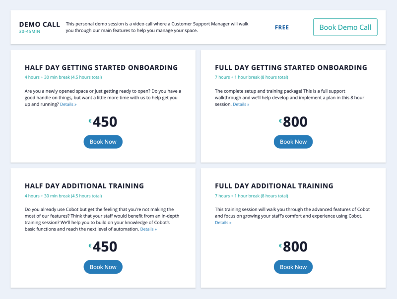 Are you just getting started using Cobot and want to bring your staff up-to-speed quickly? Or are you a long-time Cobot user who feels like you’re not quite making the most of our integrations, analytics, and booking features? In either case (and for every case in-between), our new Support Packages are there for you!