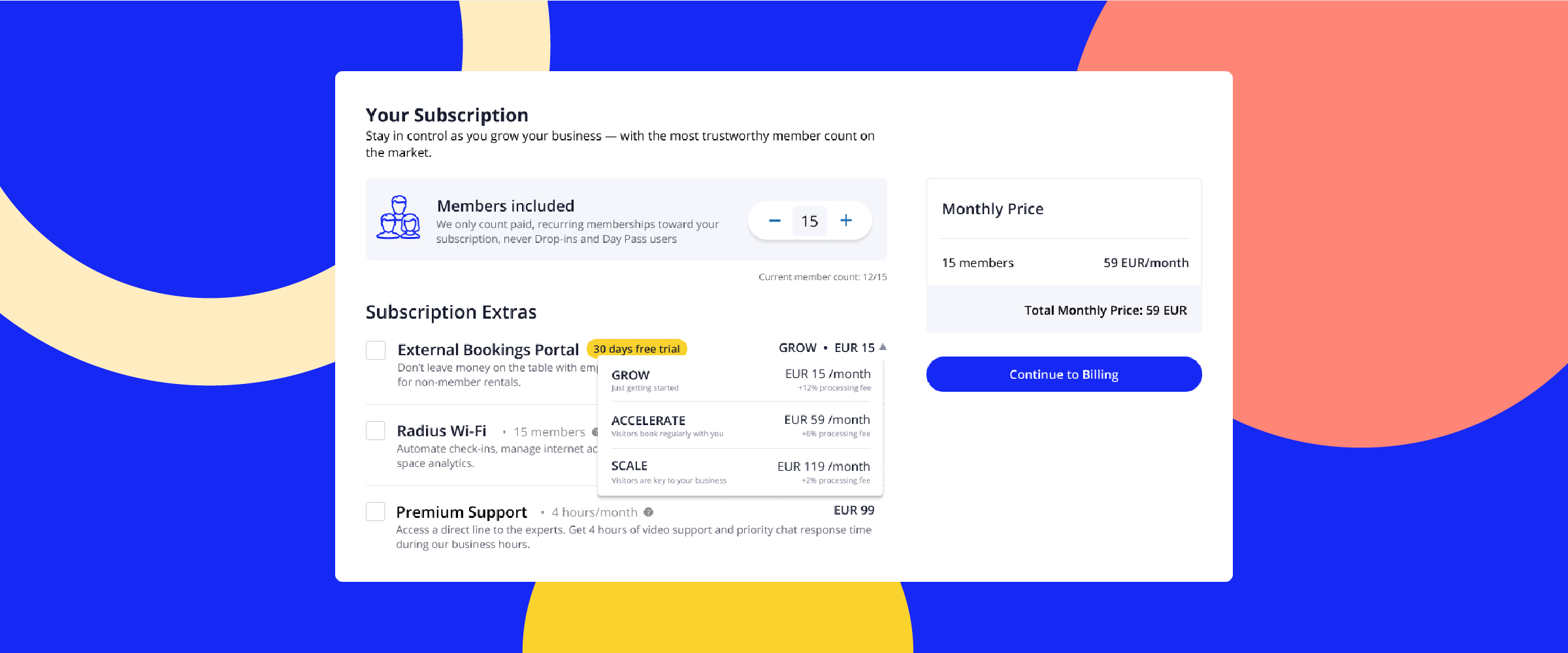 We have redesigned the experience of managing your Cobot subscription and introduced a more flexible pricing model. The core subscription can now be easily adjusted in increments of five members, and extras such as External Bookings, Radius Wi-Fi, and Premium Support can all be managed on a single page.