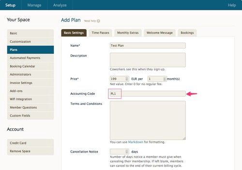 Put a checkmark there and an accounting code field will appear on all forms related to charges that will eventually show up on your invoices, like plans, extras, time passes, and one-time charges.