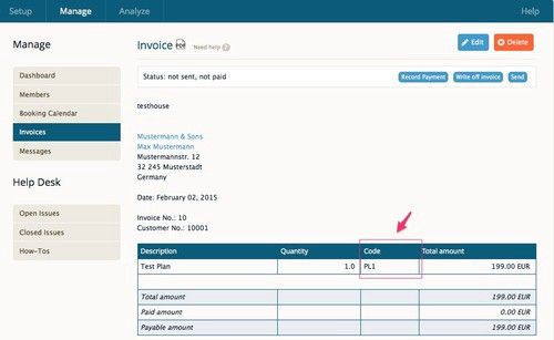 In the following example, you can see we defined PL1 as the accounting code for a plan called “Test Plan” with a price of 199€.