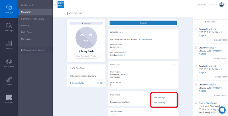 First up, we’ve improved the workflow for admin booking features. Now, when an admin goes to a member’s profile in the members section of the admin panel, they’ll find the option to see that member’s bookings and to add a booking. When the link is clicked, it directs to the calendar page where the admin can add a booking with the member’s information already filled out.