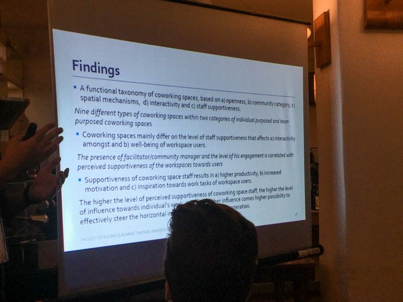 Kicking off the researchers’ presentations was Victoria Heinzel with new insights into the different coworking models. Beginning with rural coworking, she shared key observations about the ways in which coworking models must respond to their unique challenges. Rural coworking is seen as a driver of revitalization and community engagement on multiple levels, and must therefore engage with the community differently than their urban counterparts. On the other hand, her findings from corporate coworking suggest the potential for spaces to excel by driving an entrepreneurial mindset among employees and allowing for more flexible leadership and creative structures within larger organizations.